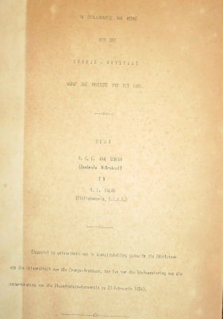 A bibliography compiled together with an exhibition of books held by the University of the Orange Free State on the anniversary of the Bloemfontein-Konvensie. Original (?) cloth-backed boards. Pp. vii,113. Cyclostyled, printed on one side of the page only. Signature inside front cover, some browning & foxing. A scarce bibliography, with text in Afrikaans
