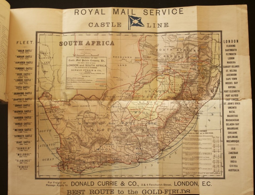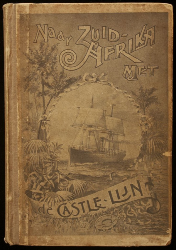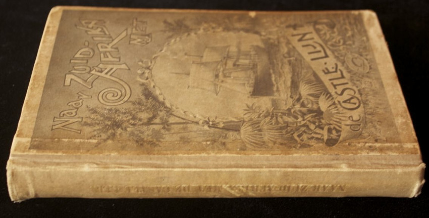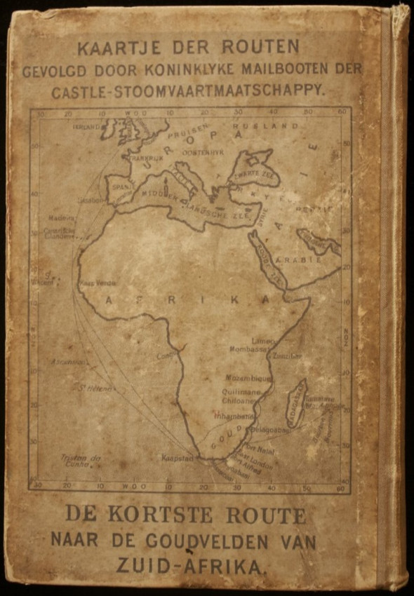 Publisher's cloth and paper-covered binding with illustrated front panel and a map of Africa on the rear panel depicting "The Shortest Route to the Goldfields of South Africa".