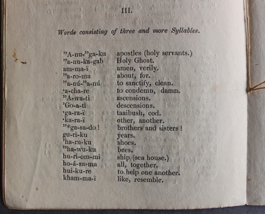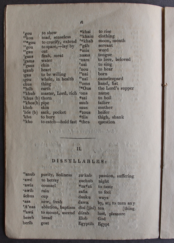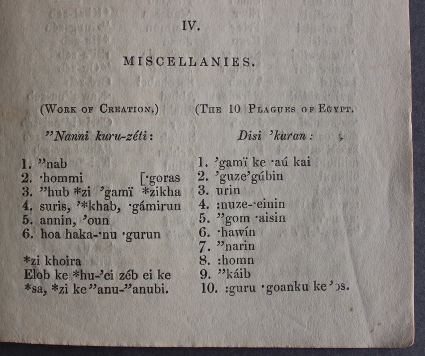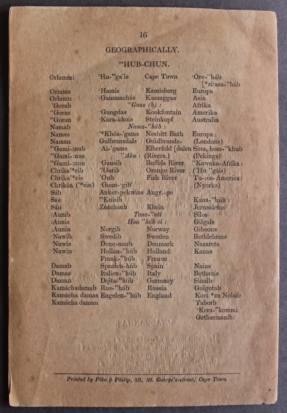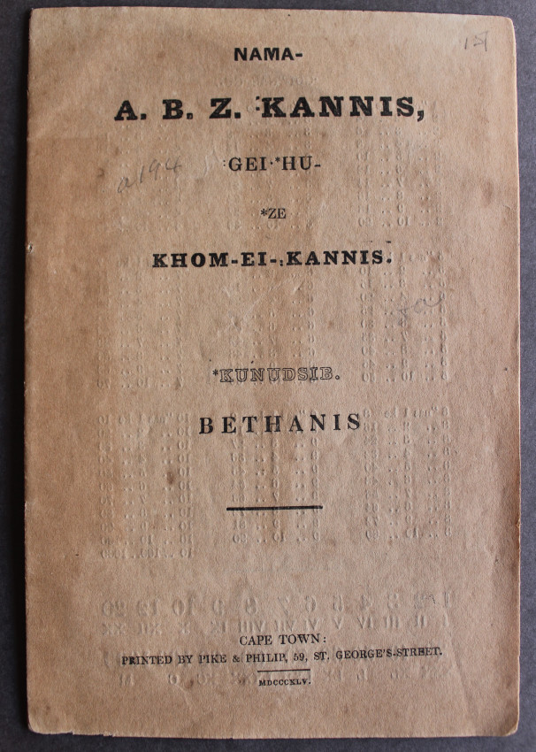 FIRST (and only) edition, comprising the very first language primer for the Nama language in South West Africa. The sub-title apparently translates as "Shouting Together and Reading Book". This spelling and reading book includes vocabularies with an English translation, and part of a catechism; viz., the Ten Commandments, part of St. Augustine's creed, the Lord's Prayer, &c."
