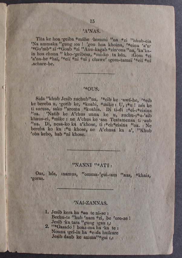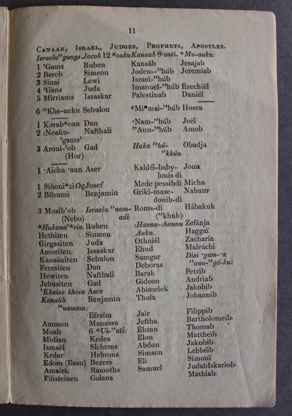 Knudsen's translation of the Gospel of Luke and the two aforementioned Cape Town publications were key sources for RMS Inspector J.C. Wallmann's Vocabular der Namaqua Sprache nebst einem Abrise der Formenlehre derselben ("Vocabulary of the Nama Language and Fundamentals of its Grammar," Barmen, 1854). His Gospel of Luke in Khoekhoe was published in Cape Town with some hymns in 1846 after a few productive years of learning the language with the help of two Nama translators. Though slightly proofread on spelling from the earlier publications, Wallmann's copy was rendered so meticulously that it was virtually free of printing errors, and Wilhelm Bleek described it in 1858 as "so far the best and most reliable source on [Khoekhoe]". Though somewhat rigid, it rendered idioms accurately. (Wikipedia)