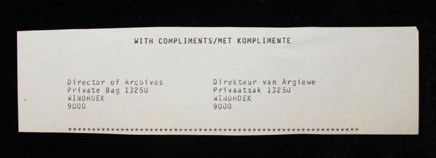 Published by the National Archives of Namibia and printed by Ultra Press, Windhoek, 1988.