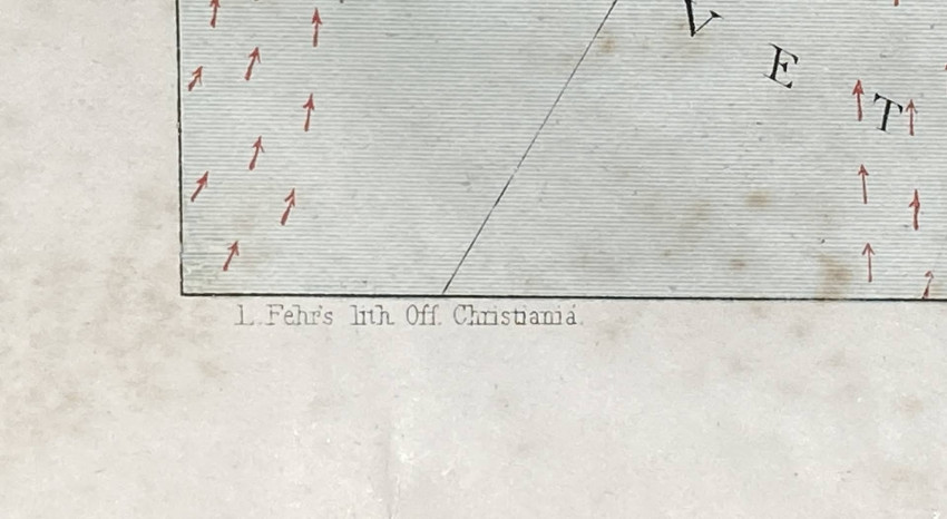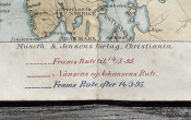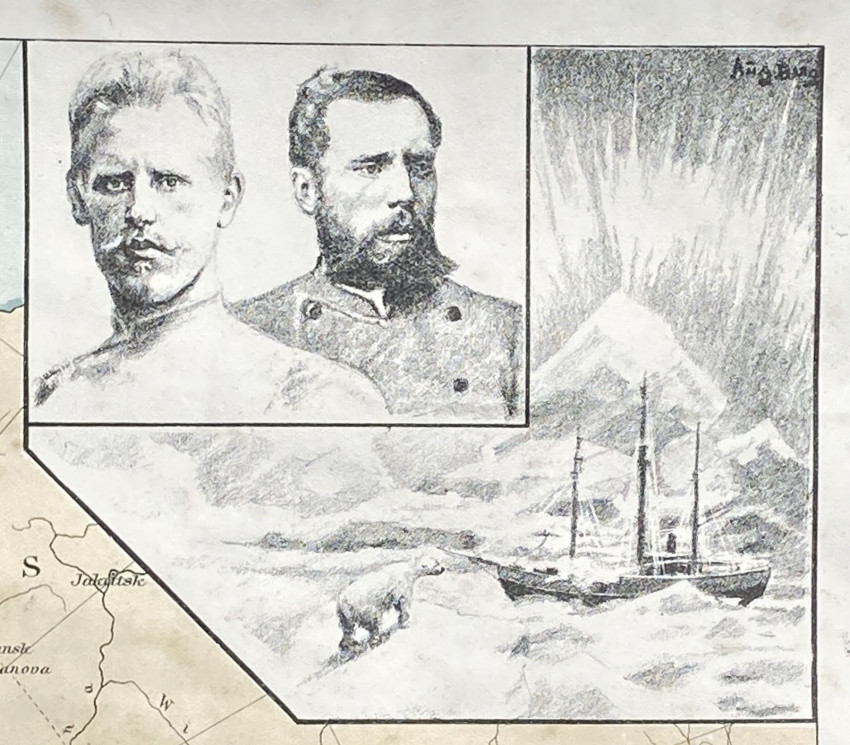 Christiania: Museth & Jensen’s Forlag, 1896. Single sheet map, printed in black and three colors, title lower right, vignette illustration upper right including a portrait of Nansen and the Fram in the ice.