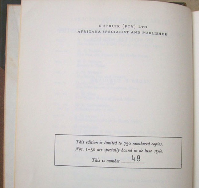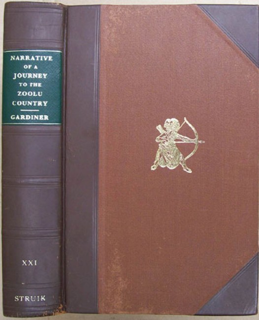 This is the 21st volume in the Africana Collectanea Series. This edition was limited to 750 numbered copies, of which the first 50 were bound in the "de luxe" style. Original brown leather spine and corners with a green title label on the spine with gilt titling and the publisher's device on the upper board. 7 prelims with a note about the author, followed by the facsimile of the 1836 William Crofts, London edition with iv prelims, 416 pages, 2 folding maps, and 28 black and white illustrations.