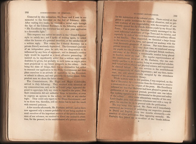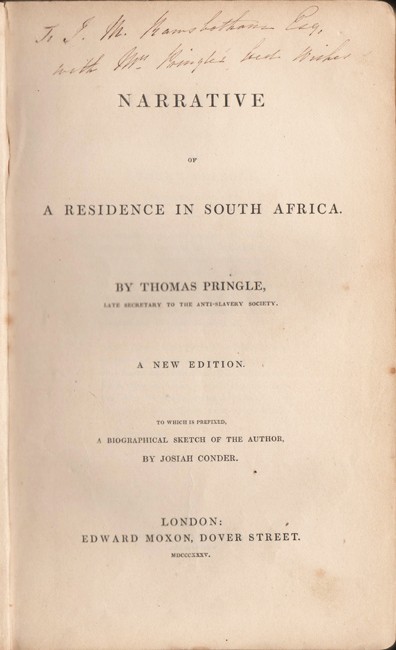 ‘...and though he tells us that he weighed carefully the advantages of the several British Colonies before he fixed upon the Cape as the most suitable place to recoup the family fortunes, the introduction of and the publicity given in 1819 to the Government's scheme to establish settlers in the Eastern Districts of the Cape Colony must have considerably influenced him. That he did come to the Cape, albeit for only six years, we can be grateful, for though not perhaps a great man he was of more than ordinary ability and of the greatest integrity - no mean protagonist in the fight for truth and the relief of oppression. That he had his failings - principally a lack of tact and caution - will become apparent.' Lewin Robinson in his introduction to the facsimile reprint published in 1966.