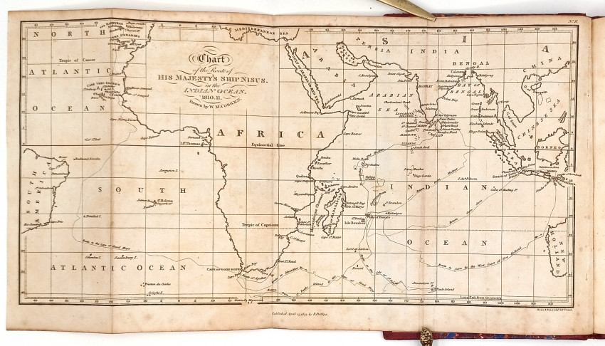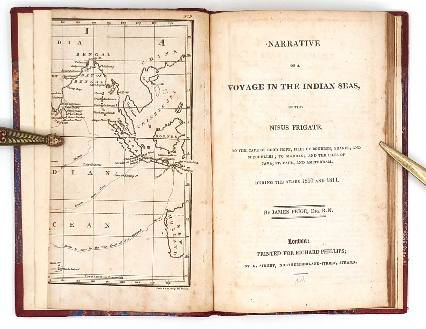 'Prior, Sir James (c. 1790–1869), writer, son of Matthew Prior, was born at Lisburn, co. Antrim, about 1790. He entered the navy as a surgeon, and sailed from Plymouth in the Nisus frigate on 22 June 1810 for the Cape of Good Hope, Mauritius, the Seychelles Islands, Madras, and Java (at the capture of which by the British in September 1811 he was present). This journey he described in a Voyage in the Indian Seas (1820). His next expedition (1812–13), in the same frigate, was to South Africa, Brazil, and other areas, and was described in a Voyage Along the Eastern Coast of Africa (1819).'Oxford Dictionary of National Biography, W. P. Courtney, revised by Elizabeth Baigent (https://doi.org/10.1093/ref:odnb/22813)