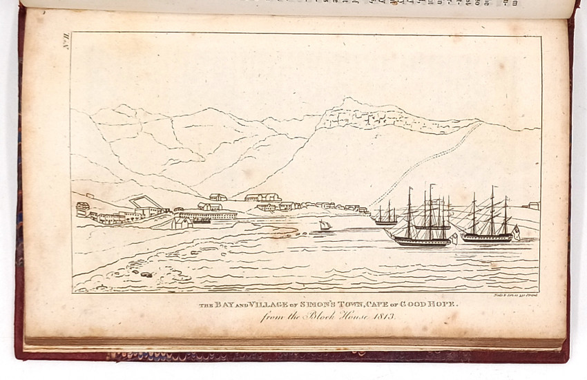 First Edition: iv + 112 pages, 2 maps - 1 folding, plan of the Landing of the British Army in Mapou Bay, Isle of France, 1 etched plate - The Bay and Village of Simon's Town, Cape of Good Hope, from the Blockhouse, 1813, half red morocco with marbled paper sides, titled gilt along the spine, bookplate on the front paste-down endpaper, some light foxing, a very good copy.