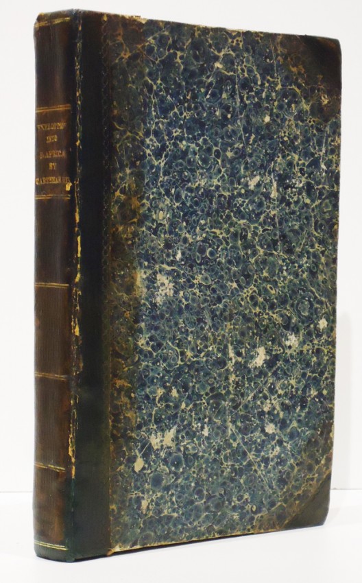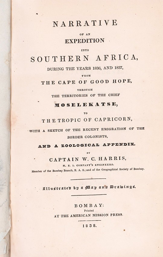 Mendelssohn (Sidney) South African Bibliography volume 1 pages 686 - 688: The first edition of this well-known and valuable work. The author states, in his Introduction, that from his boyhood upwards he was affected with "shooting madness," in consequence of which he was considered by his "partial friends to be fitting food for shot and powder." Accordingly he was entered at the Military College, and at sixteen was already an officer in the Engineers. In the course of his military career in India the Bombay Medical Board ordered him to proceed to the Cape of Good Hope for two years, with a welcome recommendation to travel, a hint which he immediately accepted, determining to use his opportunities of contributing to the geography and natural history of the countries he intended to explore, as well as of enjoying the incomparable hunting then to be obtained in South Africa.