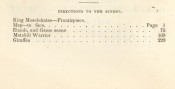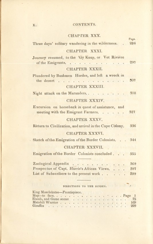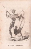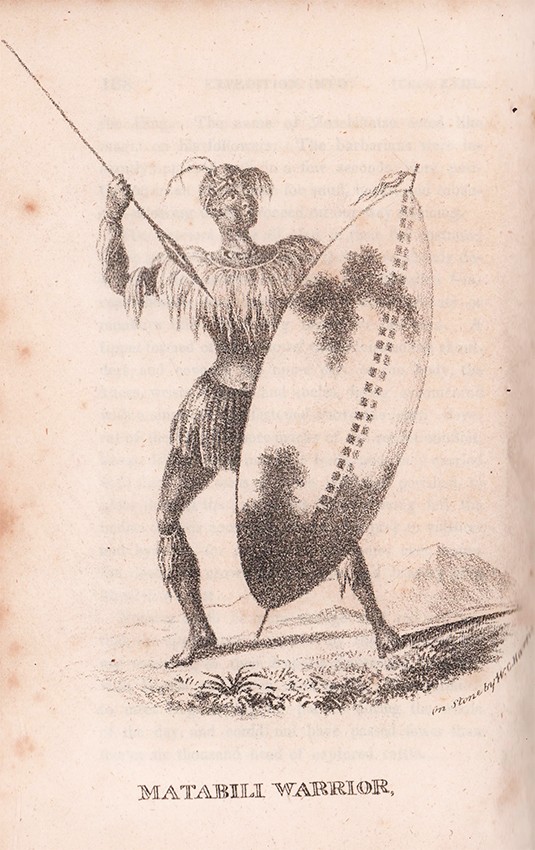 A South African Bibliography, Volume 2 page 506: The plates are 4 lithographs by Harris, all signed: On stone by W.C. Harris. The frontispiece has a caption - Moselekatse King of the Amazooloo and the third plate has a caption - Matabili Warrior, the second and fourth plates are without captions.