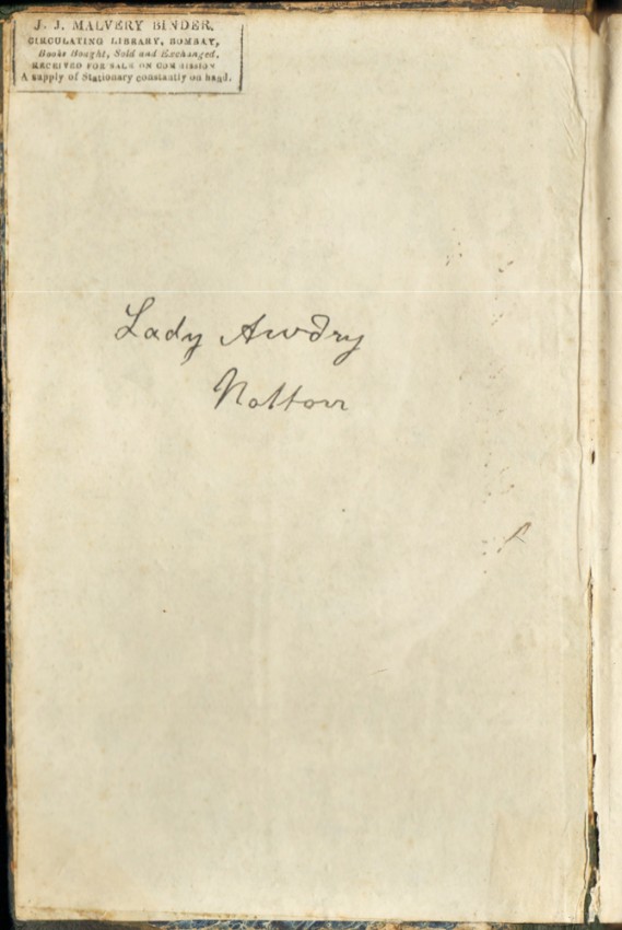 Sir John Wither Awdry DL (21 October 1795 – 31 May 1878) was an English-born Indian judge. He was married twice - the second marriage to Francis Ellen Carr in 1839. The ownership mark of Lady Awdry is undated, but Sir John returned to England and died at Notton House. https://en.wikipedia.org/wiki/John_Wither_Awdry