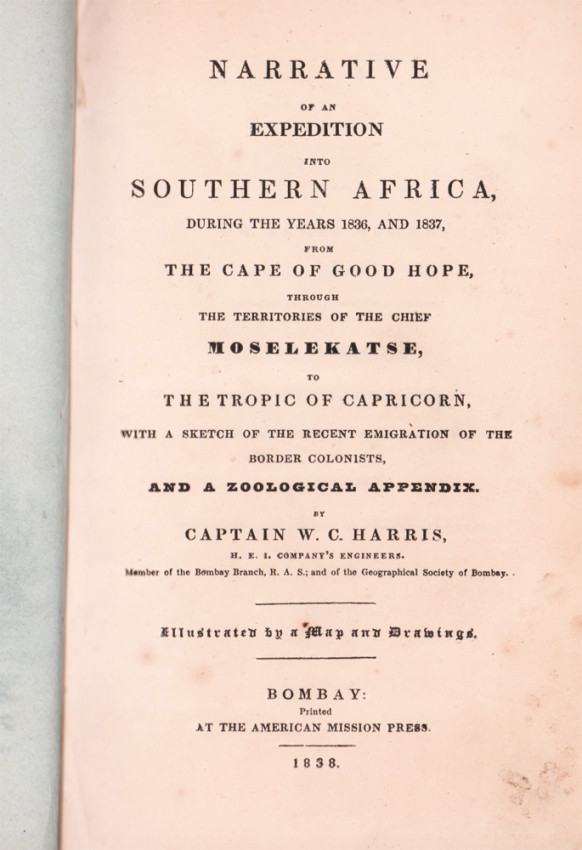 Mendelssohn (Sidney) South African Bibliography volume 1 pages 686 -688: The first edition of this well-known and valuable work. The author states, in his Introduction, that from his boyhood upwards he was affected with "shooting madness," in consequence of which he was considered by his " partial friends to be fitting food for shot and powder." Accordingly he was entered at the Military College, and at sixteen was already an officer in the Engineers. In the course of his military career in India the Bombay Medical Board ordered him to proceed to the Cape of Good Hope for two years, with a welcome recommendation to travel, a hint which he immediately accepted, determining to use his opportunities of contributing to the geography and natural history of the countries he intended to explore, as well as of enjoying the incomparable hunting then to be obtained in South Africa. He arrived at the Cape when the Great Trek was the burning topic of the day, the subject of severe strictures, as well as of sympathetic approval an event without parallel in our colonial history, and he was enabled to give some reliable and interesting details with regard to the proceedings of the emigrant farmers, together with a careful and unbiased account of the motives and grievances which led to their perilous and adventurous expatriation. The author sailed from Bombay on March 16, 1836, and on board made the acquaintance of Mr William Richardson, who agreed to join in the expedition; and on their arrival in Cape Town they met Dr. Andrew Smith, from whom they received valuable information as to their journey.….There are two chapters on the " Great Trek," and in the Appendix there is a description of South Africa "Ferae Naturae." There is also an interesting map " exhibiting the relative positions of the emigrant farmers and the native tribes."