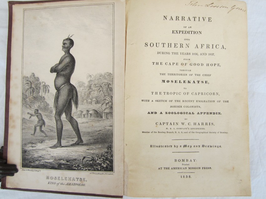 Variant issue of the first Bombay edition, which predates the first London by a year, "scarce" (Czech). Harris was commissioned in the Bombay Engineers in 1823, promoted captain in 1834 and major in 1836. Invalided to South Africa for two years, on the voyage out he joined up with Richard Williamson, a Bombay civil servant, deciding to undertake a big game hunting expedition.