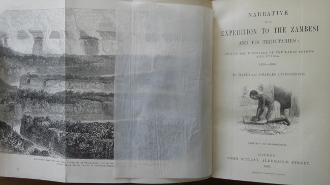 xv + 608 pp of text (no index) + folding engraving of the Victoria Falls with tissue protector at the front + 35 other illustrations, including 14 inserted full-page plates + folding map at the back. There is a small engraved design on the title-page. There is a dedication page (to Lord Palmerston) as well as pages for the preface and a postscript to the preface.
