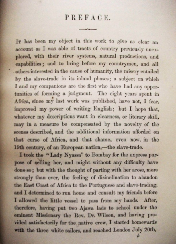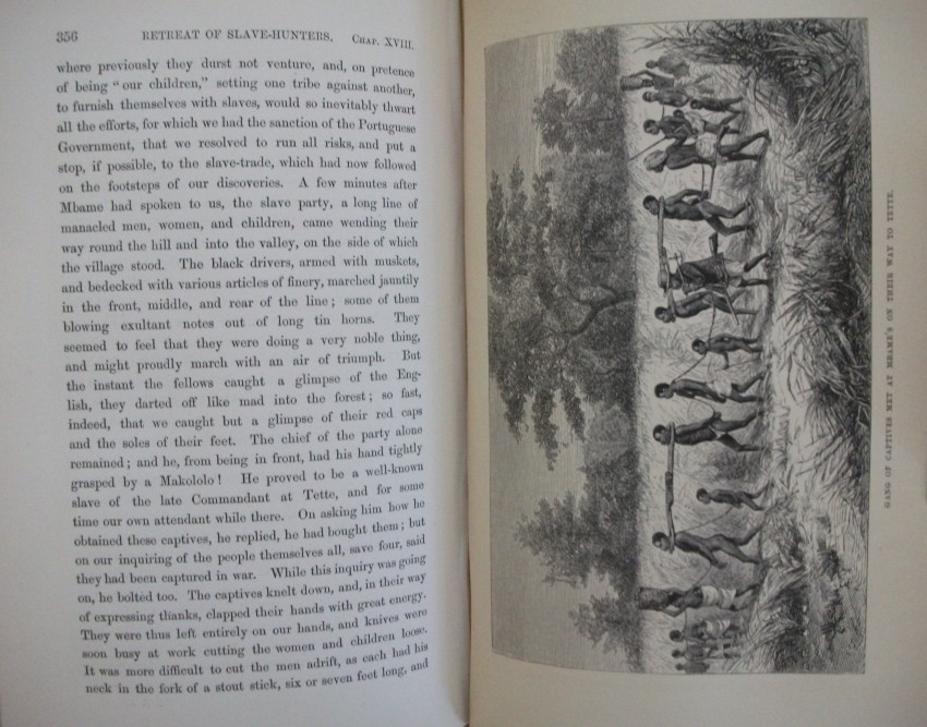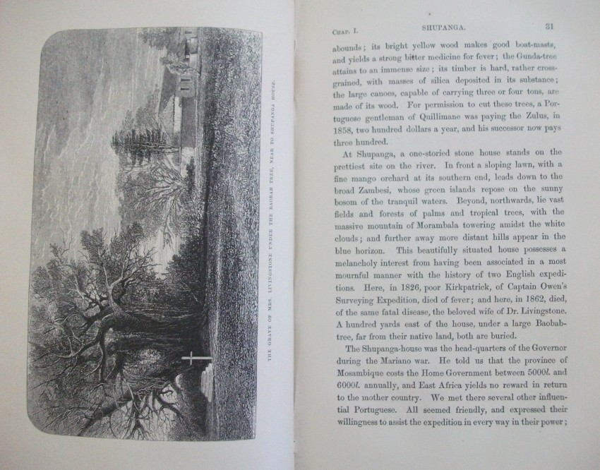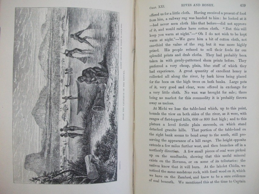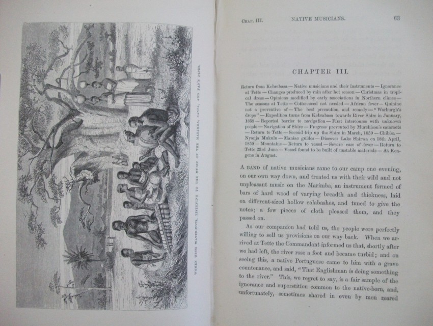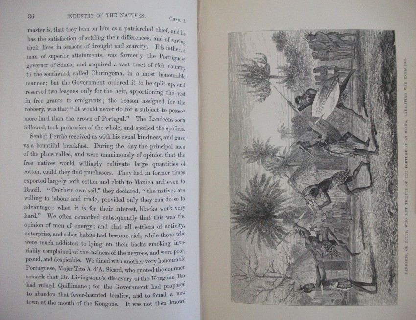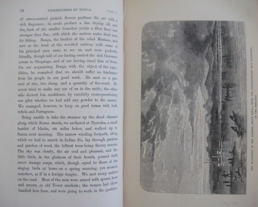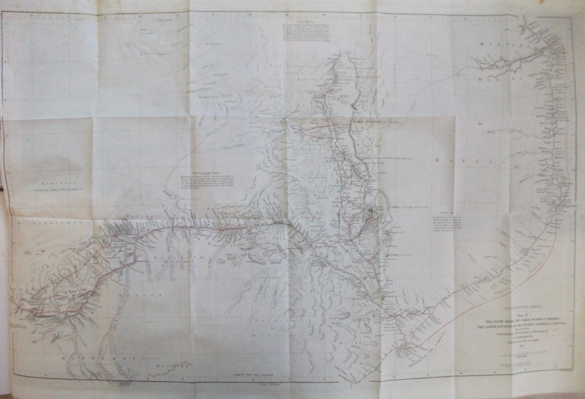 xv + 608 pp of text + 21 inserted lithographic plates + a further 13 illustrations in the text + a 24-fold 2-colour map bound in at the back. Some of J W Whymper's lithographs are from photographs by Charles Livingstone and Dr Kirk, while five are from original paintings by Thomas Baines - who were all members of the expedition. The map, "constructed by John Arrowsmith", shows "the River Shire, the Lakes Nyassa and Shirwa, and the Lower Courses of the Rivers Zambesi and Rovuma", and is "based on the Astronomical Observations & Sketches of Dr Livingstone", with "the route of Dr Livingstone and the Officers of the Expedition" printed in red.