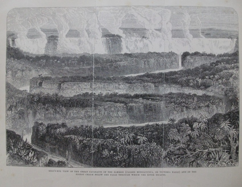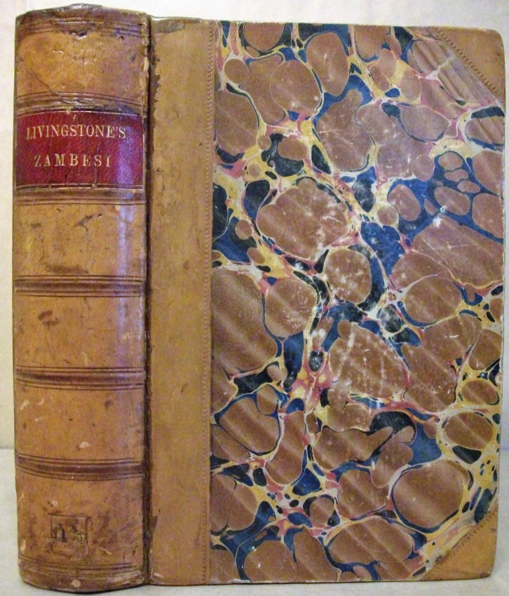 DESCRIPTION. Half-bound in tan calf and matching marbled-paper sides, with "Livingstone's Zambesi" lettered in gilt on a scarlet panel in the second pocket and a heraldic device (see Ownership above) blind embossed to the sixth pocket. All page edges are trimmed and the text-block is rounded; the top edge is gilt and the other edges are spotted red. There is no acknowledgment to the binder, but the printer was William Clowes and Sons of London. The plain matching endpapers are one-sided. A 3-fold monochrome engraving ("Bird's Eye View of the Great Cataracts of the Zambesi . . . and of the Zigzag Chasm below the Falls") is the frontispiece, opposite the title-page, which includes a vignetted illustration. There are dedication and preface pages, as well as a postscript to the preface, contents pages, and list of illustrations.