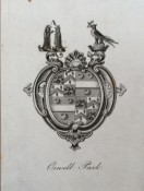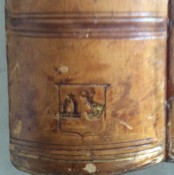 OWNERSHIP. This copy was previously owned by George Tomlin Pretyman (1812-1889), whose crests are gilt-embossed in the sixth pocket of the calf spine and whose Orwell Park bookplate, which incorporates the two crests, is pasted on to the front paste-down (see images). Another book with the same crests to the spine is by R Torres (1844), now in the Princeton Museum. The two crests are Tomline ("out of a coronet a martlet holding in its beak a branch of oak") and Pretyman ("two lions gans erect holding a mullet), whole a copy of the bookplate is in the Fine Arts Museum of San Francisco.