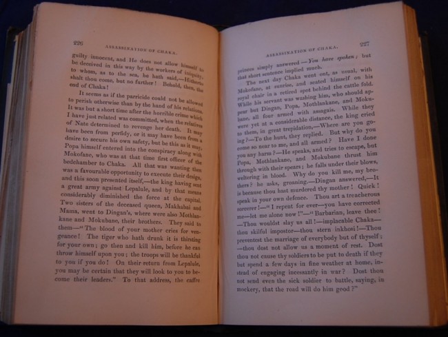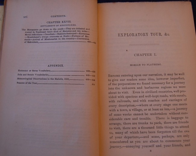 \"An account of a tour taken by two French Protestant missionaries who were settled in Basutoland, to that part of South Africa between the Orange and the Vaal Rivers, which was mainly inhabited by the Bechuanas. The tour lasted about three months, and much of the information published was related for the first time, including notes on the Bushmen, Corannas, Basutos, Bechuanas, Griquas, Zulus, and other nations, with chapters on botanical and geological matters, hunting and even literature. There is a full account of the Zulu army, including the names of the regiments, together with those of the Commanders, Lieutenants, and sub-Lieutenants, and there are interesting accounts of Chaka and Dingan, with a description of the death of the former, and an ode to the latter.\" (p.49 Mendelssohn I)