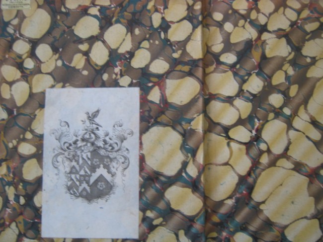 The volumes are half-bound in tan calf with blue cloth sides, marbled endpapers, top edges gilt and other edges red speckled. Four raised bands with gilt title and author lettering on black labels in pockets 2 and 4 of the spines, with the volume numbers gilt at the foot of the spines. The endpapers are marbled, with an armorial book-plate on the front paste-down of Vol I.