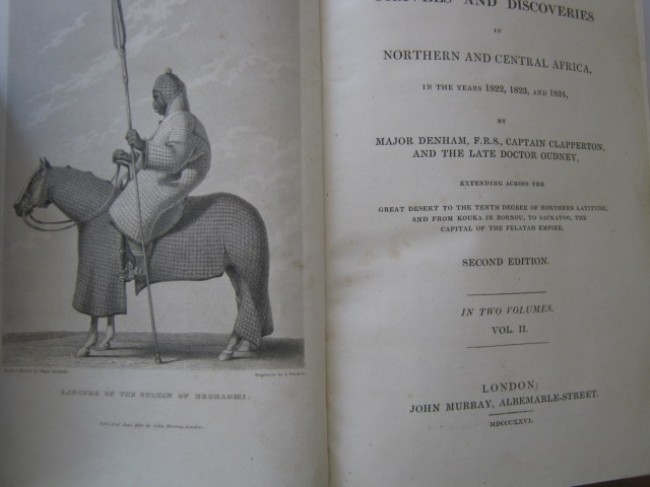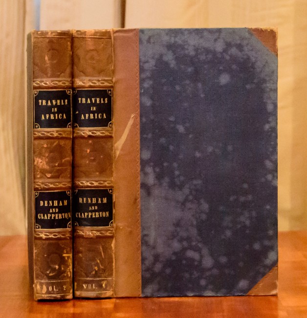 This is a very good set of the 1826 second edition of the two volumes by Denham and Clapperton on their 1822-24 travels in North and Central Africa with the late Dr Oudney. The reserve reflects the rubbing and other cosmetic damage to the covers. The binding, however, and the cover boards remain strong.