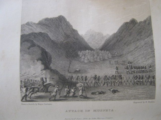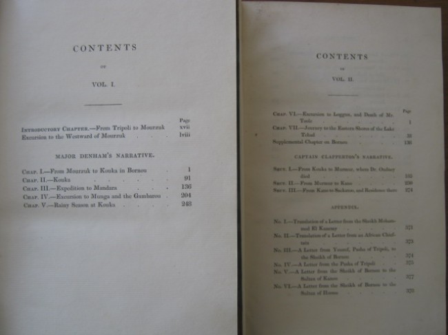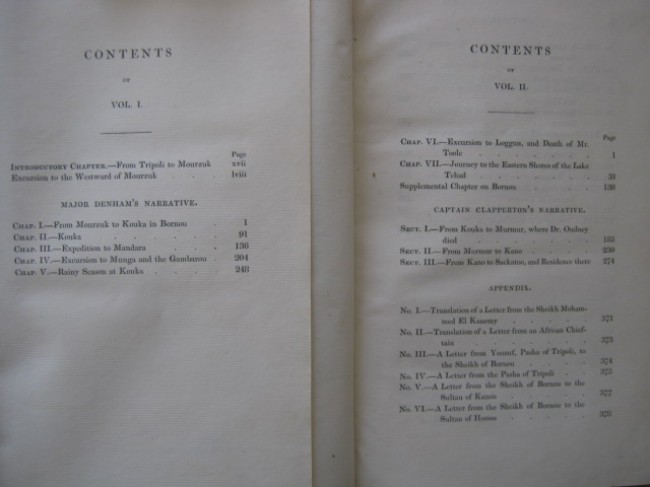 Vol I. lxxxviii + 321 pp + 10 inserted colour or monochrome engravings + large folding map + other small engravings in the text. The prelims included Major Denham's introductory chapter.