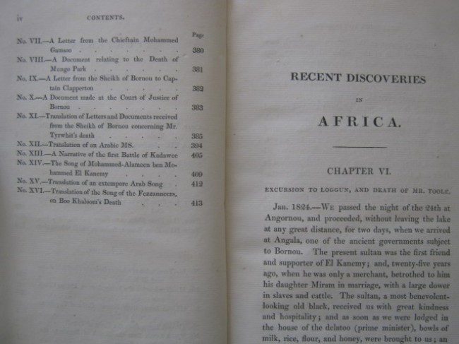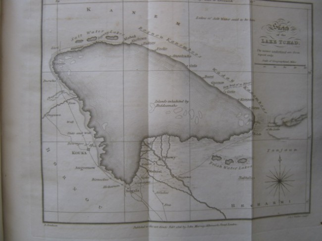 Vol II. iv + 413 pp of text and 16 appendixes + 1 other inserted engraving + folding sketch of Lake Tchad + a folding reduced version of Bello's map of Central Africa + some other small engravings in the text.