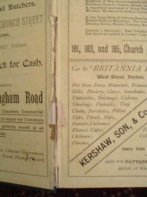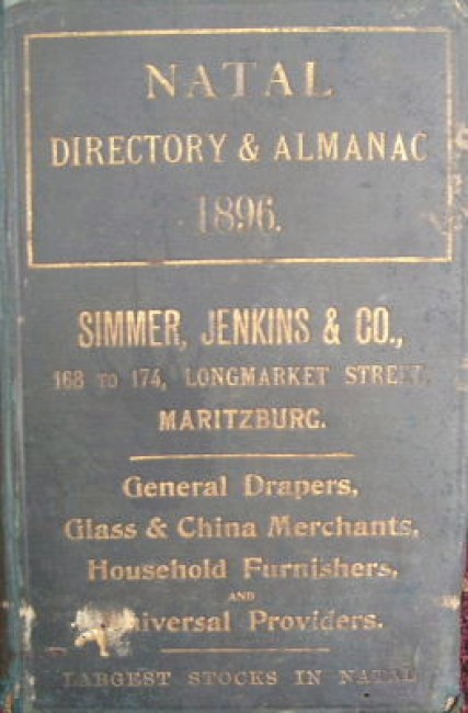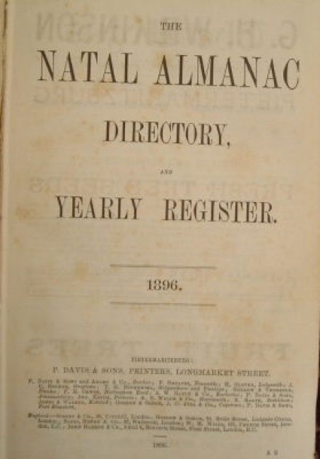 A rare Natal almanac. Unfortunately missing the section between page 25 & 81. Does contain the postal guide and directories, as well as numerous adverts.. Covers damaged by insects