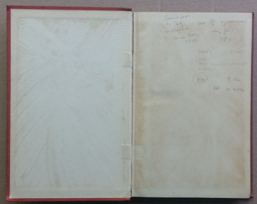 4to (22,1 x 14,7 x 1,5cm) v + 215pp. + iv appendix and index. Original read hard cover binding, with gilt lettering to front board. Red speckling to the edges of textblock. With hand-coloured lithograph frontispiece.
