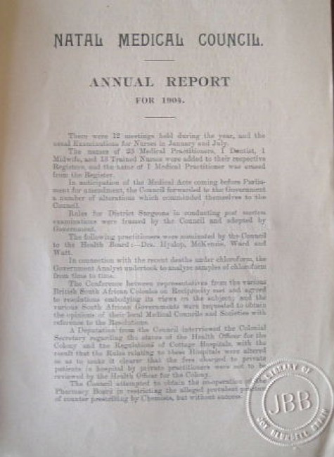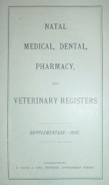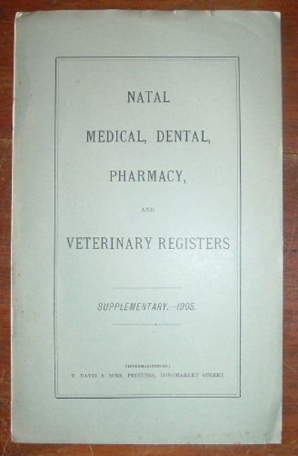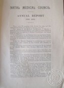 Contains the Annual Reports of the \"Natal Medical Council,\" \"Natal Veterinary Board,\" & \"Natal Pharmacy Board.\" Printer wrappers. Pp. 8. Probably a unique copy as it is not listed in SABIB, 3/458. Slight edge-wear, previous owner\'s blind-stamp on first text page.