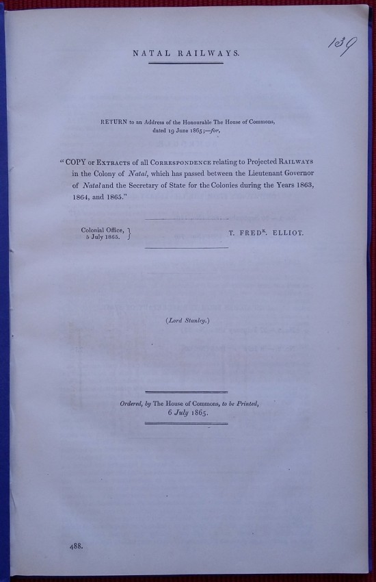 Ordered, by the House of Commons, to be Printed, 6 July 1865. Parliamentary Paper HC488.; Bound in a recent blue card thermal binder; Collation complete - 75 pages; A clean copy.