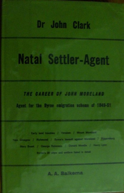 The book is therefore the biography of John Moreland but he was so intimately connected with his employer Joseph Byrne that it becomes Byrne's biography as well. Seperation came about 1850 as a result of Byrne's bankruptcy and the consequent collapse of his emigration scheme. The reasons for Byrne's failure are analysed by Dr Clark in a survey of the letters exchanged between the two men. A special feature of the book is its description of Natal more than a century plus ago. Many well-known characters of early Natal like Governor Pine, Donald Moodie, Phlip Allen, D.D.Buchanan, Lushington-Phillips, Henry Cloete, and others are portrayed in action and word. The struggles of the settlers to establish themselves in the colony of Natal gain a new dimension in their pathetic letters and appeals for assistance. Most of this material comes directly from the Moreland Family Papers and has not previously been published. Foreward by Alan Hattersley. xi plus maps- 312 pages detailed and expansive text. Very clean copy. No marks.