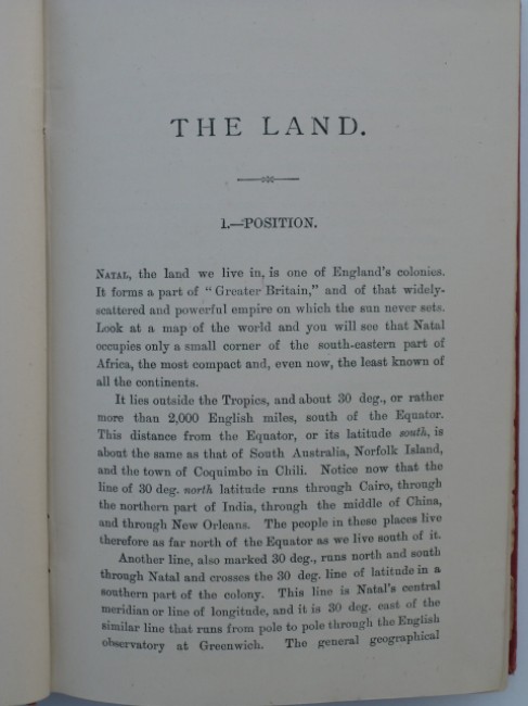 "An outline of the geography and history of Natal prepared by the Council of Education, and intended to help the young people of the Colony to acquire a knowledge of their homeland and to encourage them to take an intelligent interest in all that makes for its welfare and progress" - (preface).