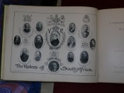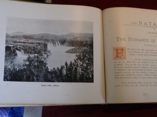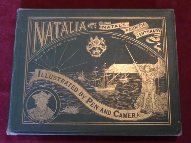 An attractively bound book, elaborate gilt stamping to front cover (and Zulu warrior on rear), pale yellow end-papers in good condition (front inner hinge cracked), multiple portrait frontispiece, and containing many early photographs of various scenes in Natal, such as waterfalls, beach and forest scenes, train lines, battlefields, buildings, portraits, river scenes, natives, etc...197pp. all edges gilt, binding shaken with first gathering loose, generally good condition throughout with the occasional finger-smudge or light fox-marks. A very interesting pictorial glimpse of Natal at the turn of the century.