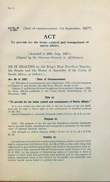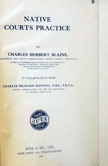 An octavo hardcover book in the original dark blue cloth binding with gilt titles to the spine. The borders of the covers are blind stamped with lines as is a Juta & Co. Device. The book is In generally good condition, firmly bound and with nice square corners. Very slight shelf wear, no foxing but with very slight browning end pages and the top right hinge of the front cover has a 5cm split. Eleven preliminary pages plus 234 pages of text, including a general index. Having assumed responsibility for its Black citizens the Union of South Africa had presented the legal profession with the difficult task of combining the tribal systems of justice, which had operated from time immemorial, with Western systems of justice as incorporated in Roman Dutch Law. The need for a consolidated set of Acts and amendments gave rise to this volume. The matter is discussed in the Foreword by General JBM Hertzog, then Prime Minister of the Union, who points out the importance of considering the needs of people in the diverse population of the country.