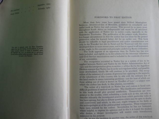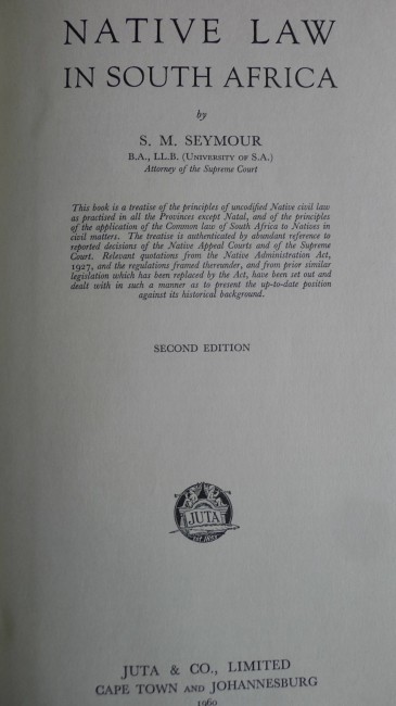 As Natal Law Professor Burchell notes in his foreword, S M Seymour's book (first edition: 1953) followed more than forty years after his father's (Wilfred Massingham Seymour's) book on Native law and customs was written. "The publication of the present work, therefore, is a happy circumstance in that the author has now done for the present generation what his learned father did for an earlier one."