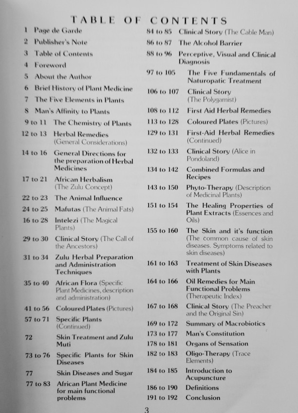 "He reveals the formulae that have stood the test of time of many generations of tribal doctors and sangomas. The medicinal use of a wide range of herbs that actually heal the Zulu and Xhosa communities has been recorded here".
