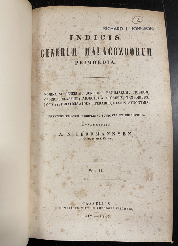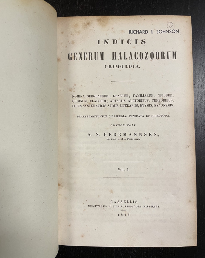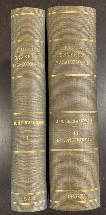 Herrmannsen, August Nicolaus. Indicis generum malacozoorum primordia ...: praetermittuntur Cirrepedia, Tunicata et Rhizopoda. Cassellis: Sumptibus & typis T. Fischeri, 1846.