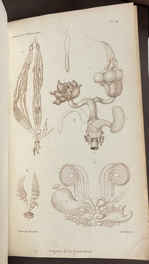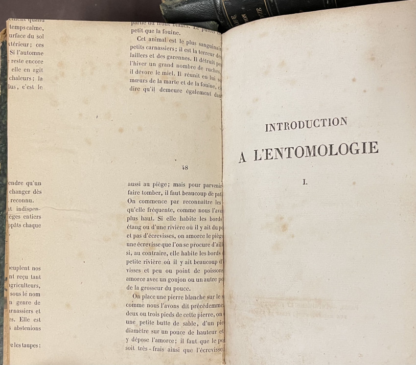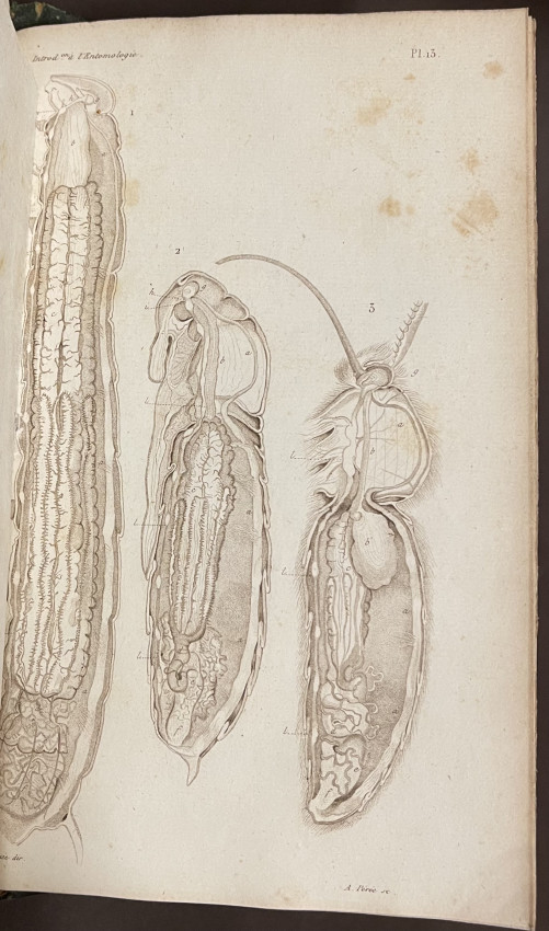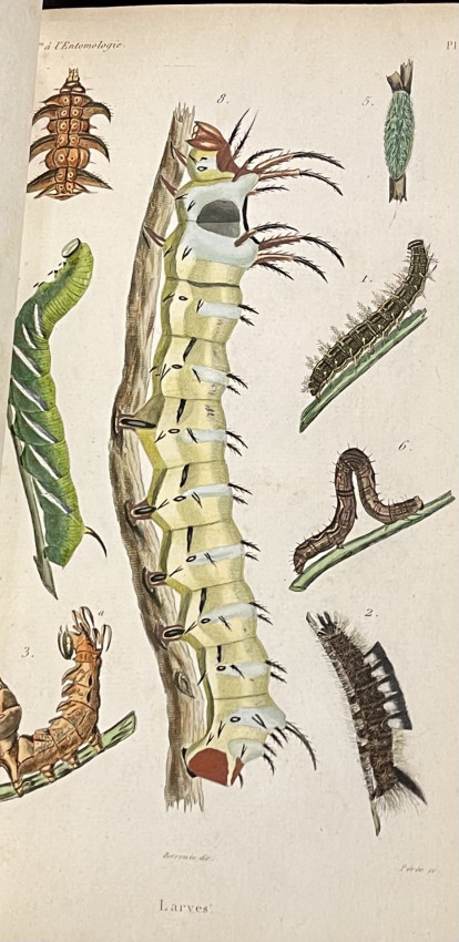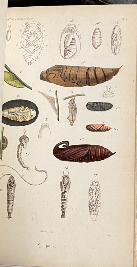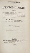 Lacordaire, Théodore, 1801-1870. Introduction à l'entomologie. Paris : Librairie Encyclopédique de Roret : Pourrat Frères, 1834-1838. 2 volumes. Later leather backed boards, with original wrappers retained (backed with printer's waste); engraved plates at end of each volume, some color. Corners rubbed, spine ends chipped; owner's stamp on endpapers.