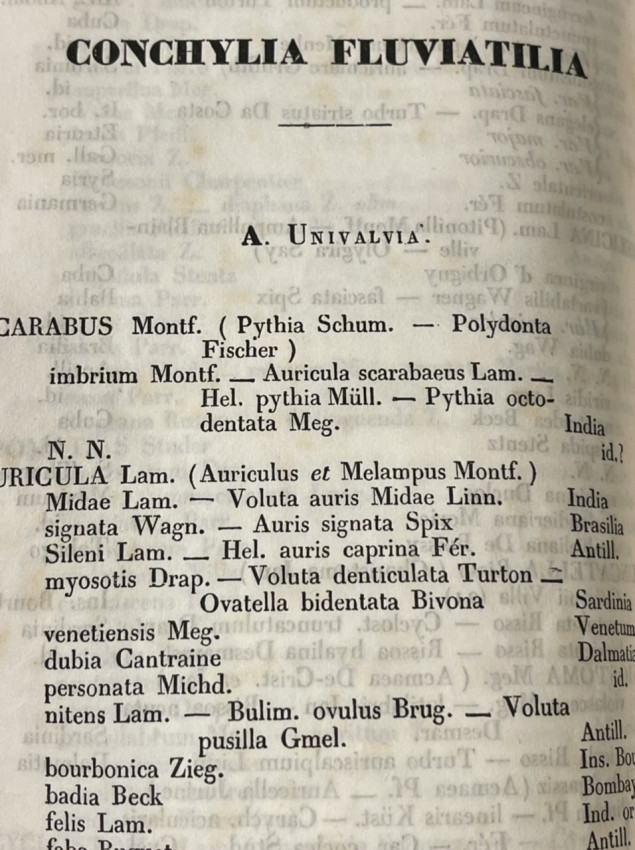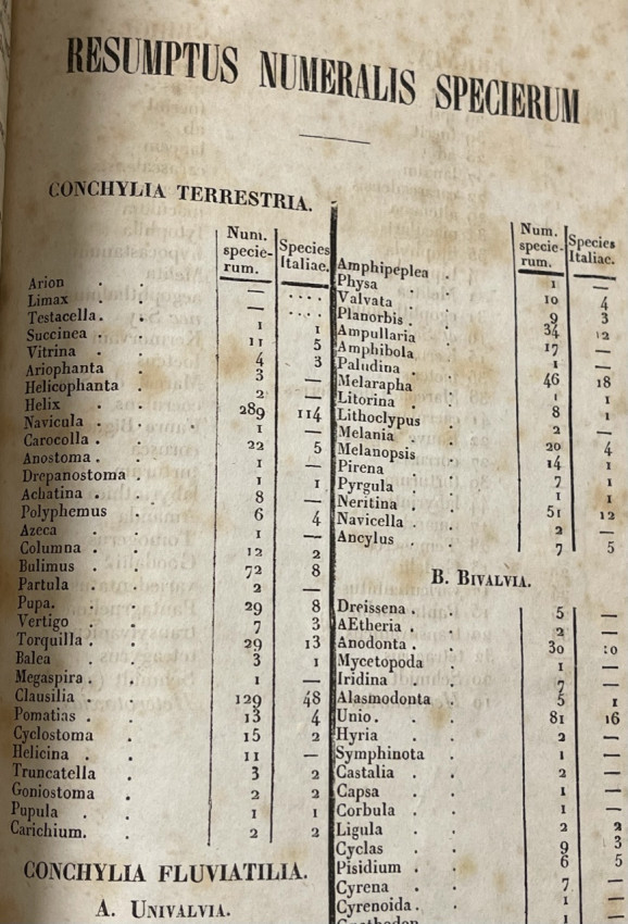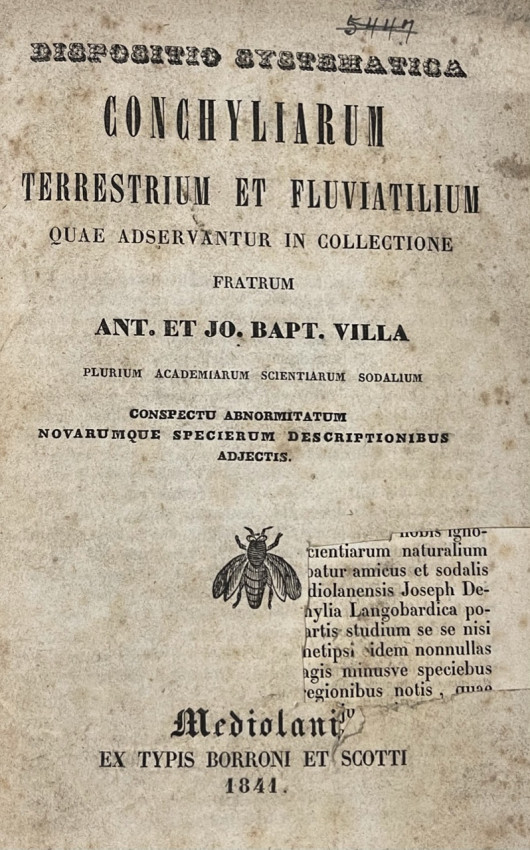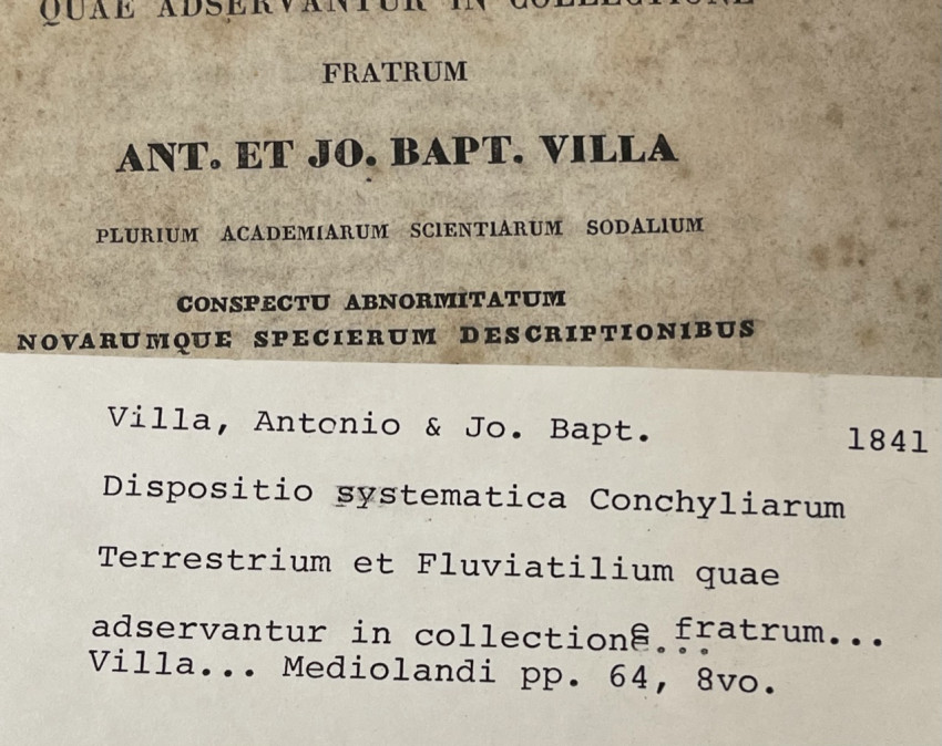 Villa, Antonio. Dispositio Systematica Conchyliarum Terrestrium Et Fluviatilium Quæ Adservantur in Collectione Fratrum A. Et J. B. Villa ... Conspectu Abnormitatum Novarumque Specierum Descriptionibus Adjectis. Mediolani: publisher not identified, 1841. Pp. 64. Title page has an excised section.