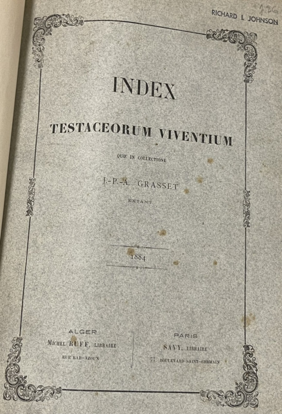 Grasset, J P. A. Index Testaceorum Viventium Quoe in Collectione J.p.a. Grasset Extant. Alger: Imprimerie Casabianca, 1884. 324 pages, original printed wrappers retained; Latin text. 30 cm