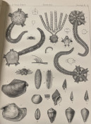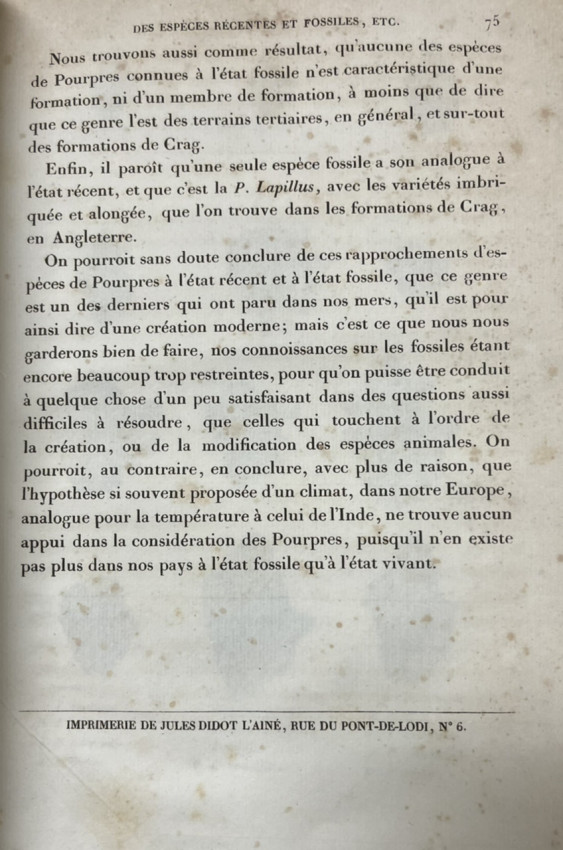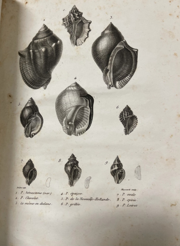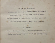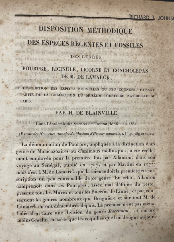 Blainville, Henri Marie Ducrotay de. Disposition méthodique des espèces récentes et fossiles des genres pourpre, ricinule, licorne et concholépas de m. de Lamarck, et description des espèces nouvelles ou peu connues, faisant partie de la collection du Muséum d'histoire naturelle de Paris. [Paris]: [Impr. de J. Didot l'ainé], 1832. 75 pages, 4 plates, no’s. 9-12; 26 cm. Title page and explanation of the plates (4pp) added in a clear hand. Bound in black cloth.Caption title./ "Extrait des Nouvelles annales du Muséum d'histoire naturelle, t. Ier, p. 189 et suiv."/ "Lue à l'Académie des sciences de l'Institut, le 26 mars 1832."