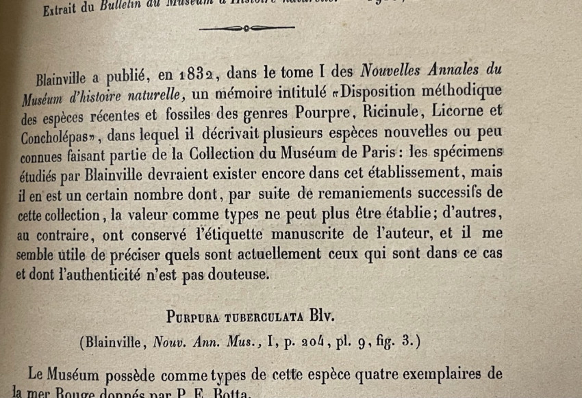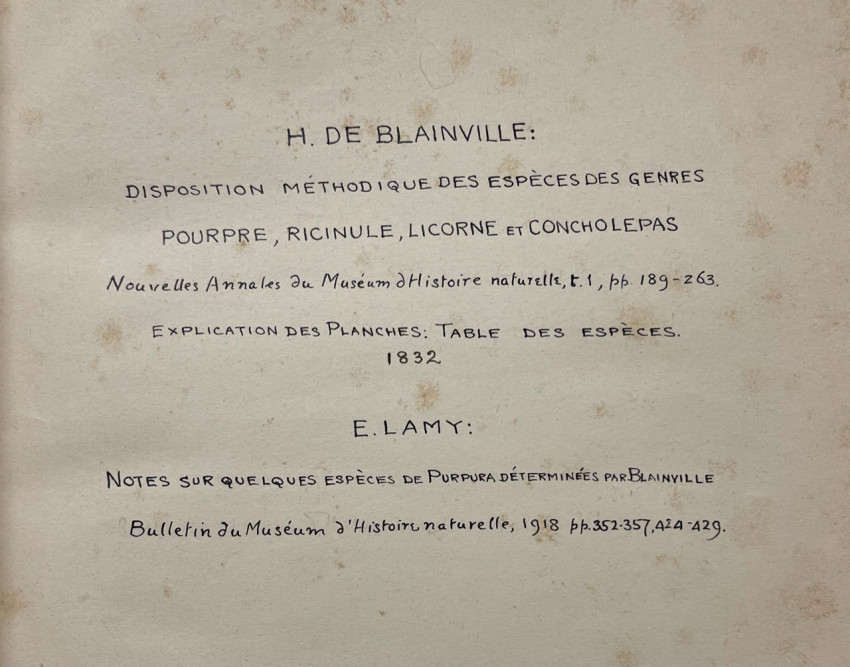 Bound together with a scarce 1918 study of the Collection by Ed. LAMY. (12p.) Lamy, Ed., 1918. - Notes sur quelques espèces de Purpura déterminées par Blainville dans la collection du Muséum de Paris. Bulletin du Muséum national d'Histoire naturelle. [1]-12.