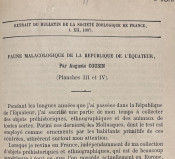 Cousin, Auguste. Faune Malacologique De La République De L'equateur. Paris: Au siège de la société,1887. 110 p., 2 plates; printed wrappers retained.