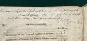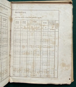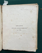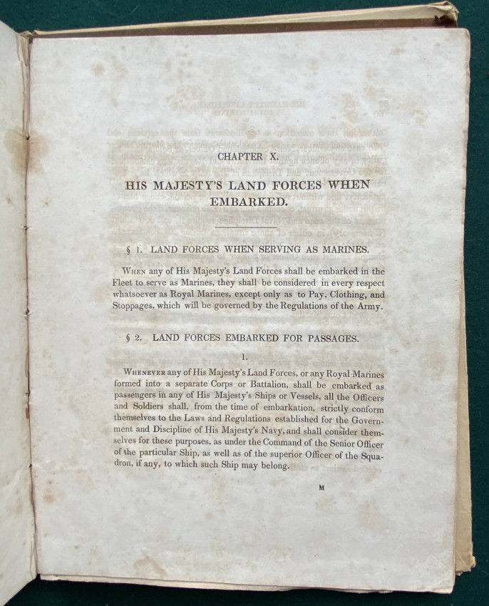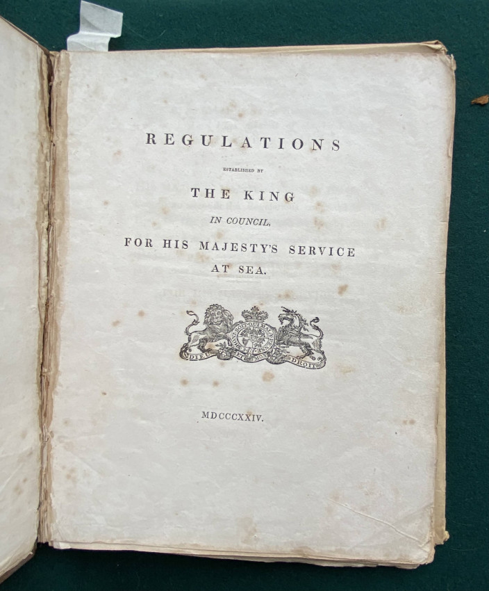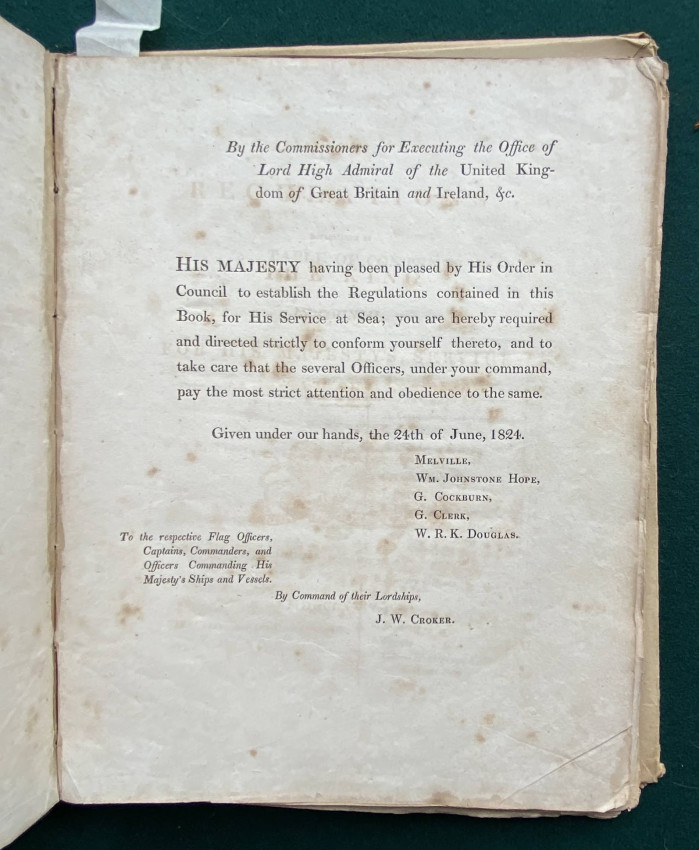 William CLOWES (printers). [Royal Navy] Regulations established by The King in Council for His Majesty's service at Sea. [London: printed by William Clowes,] 1824. Large quarto (10 5/8 x 8 1/4in; 270 x 210mm). Pp. [i-viii, 1-2]-3-83[-83-92]. (Some spotting, some leaves somewhat tattered). Original reversed calf, the covers blocked in blind with the Royal Navy stamp: a central oval containing an anchor surrounded by coiling rope (worn, spine lacking, stitching broken). Provenance: note at front ‘Rc’d 4 October 1824’ and marginal addition in the samehand to p.54; Charles Meredyth (signature to front free endpaper).