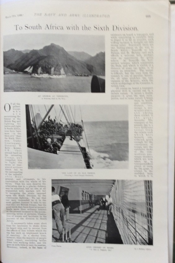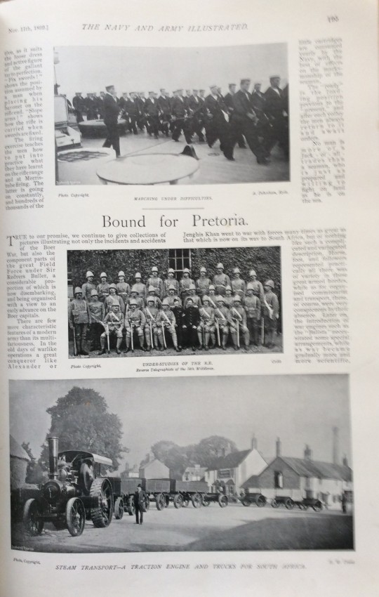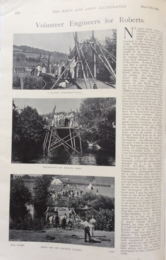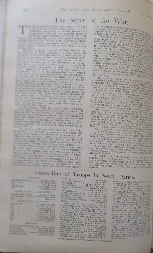 Although this was a weekly survey of Britain's military events at home and throughout the world, much of Volume IX is devoted to the early months of the Anglo-Boer War, from "The Transvaal Crisis. The Story of the Trouble from the Very Commencement" (pp 3-4) to "The Orange River Frontier" and "Volunteer Engineers for Roberts" (pp 671-2), with frequent full-page essays on "The Story of the War".