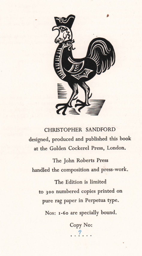 The colophon reads; Christopher Sandford designed, produced and published this book at the Golden Cockerel press, London. The John Roberts Press handled the composition and press-work. The edition is limited to 300 numbered copies printed on pure rag paper in Perpetua type. Nos 1 – 60 are specially bound. Copy no. 9
