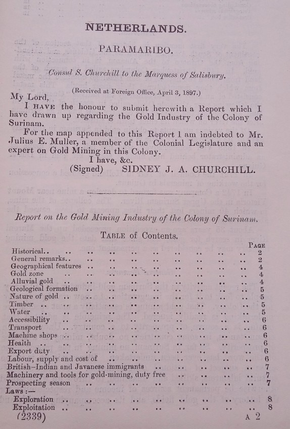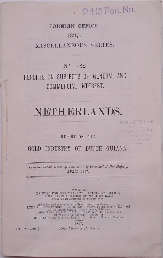"Foreign Office. 1897. Miscellaneous series No.422. Netherlands. Report on the Gold Industry of Dutch Guiana. Presented to both Houses of Parliament by Command of Her Mayesty, April, 1897."