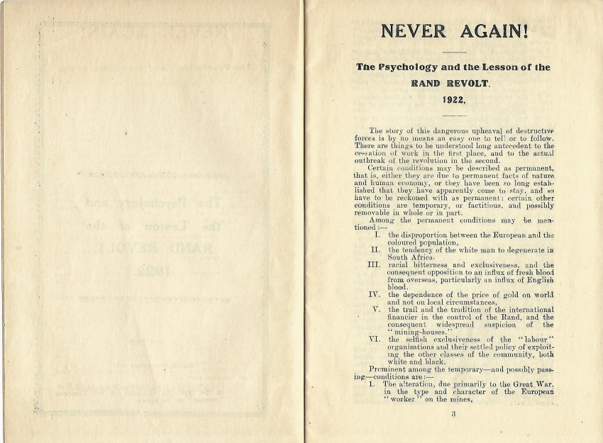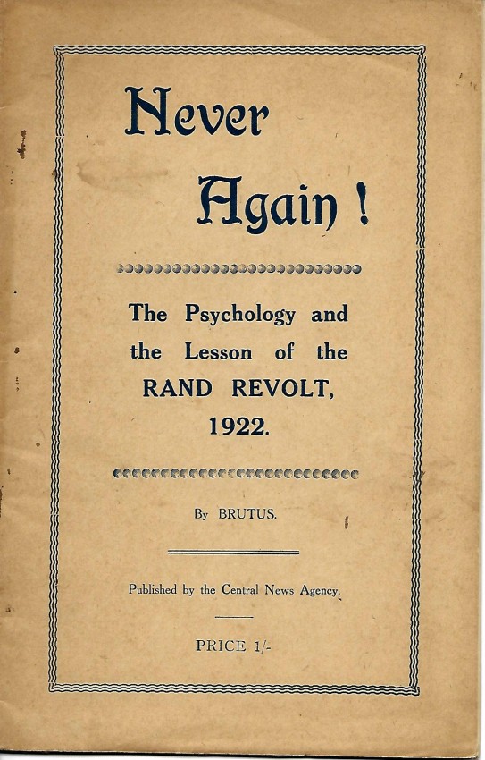 "This thoughtful and well written pamphlet sets out clearly the underlying causes of the Rand troubles and the events which led up to the rising. The author lays stress on " the tendency of the white man to degenerate in South Africa," the racial bitterness prevailing among the Dutch, and the selfishness of the labour unions among the permanent conditions. He attributes the mining dispute partly to the change in the character of the white miners, now mostly half-skilled Dutch- men, and to " the spread of Socialistic and Bolshevist propaganda by extremists, mostly of Scottish or Jewish extraction." It is surprising to find Scotland blamed in this connexion ; probably the so-called Scots, like most of the agitators on Clydeside, come from Ireland or are aliens who have taken Scottish names The author reprehends the Johannesburg people for their indifference to municipal affairs and the Government for their reluctance to deal firmly with the Bolshevik agitation until the Rand was actually in revolt. He admits, however, that when General Smuts at last took action he showed the greatest courage and firmness. The object-lesson ought to suffice for a long time to come." - The Spectator, 24 June 1922.