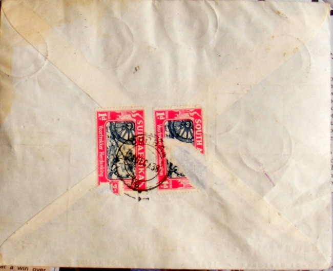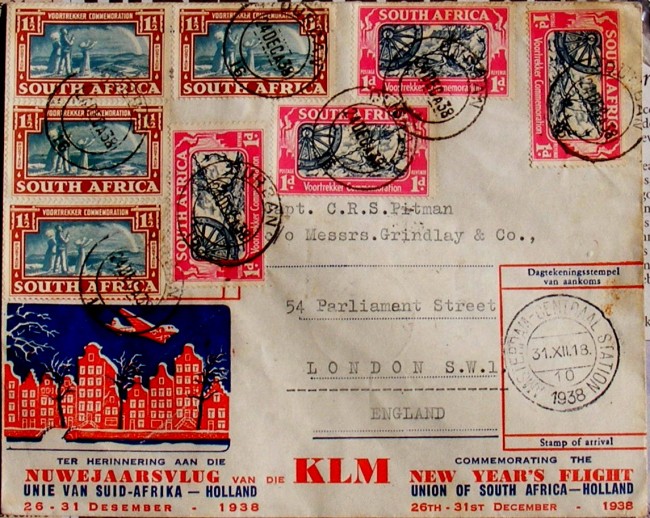 Cover commemorating the KLM (Dutch Airlines) New Year's Flight, Union of South Africa-Holland, 26th-31st December,1938, postmarks, Durban 24th December, Amsterdam Central Station 31st December 1938. 157 x 126mm, condition: good.