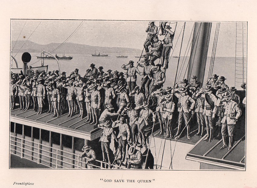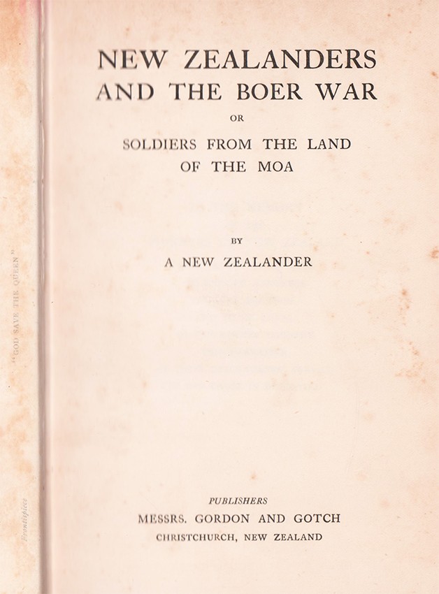 A South African Bibliography volume 3 page 536. One copy listed. According to the preface (written in the third person with reference to the author as “he”) this account of the New Zealand Contingents in South Africa is largely due to the writings of others in private letters and the public press. The final chapter is an account of the vain attempt of the Maoris to be allowed to join the white contingents sent to South Africa.