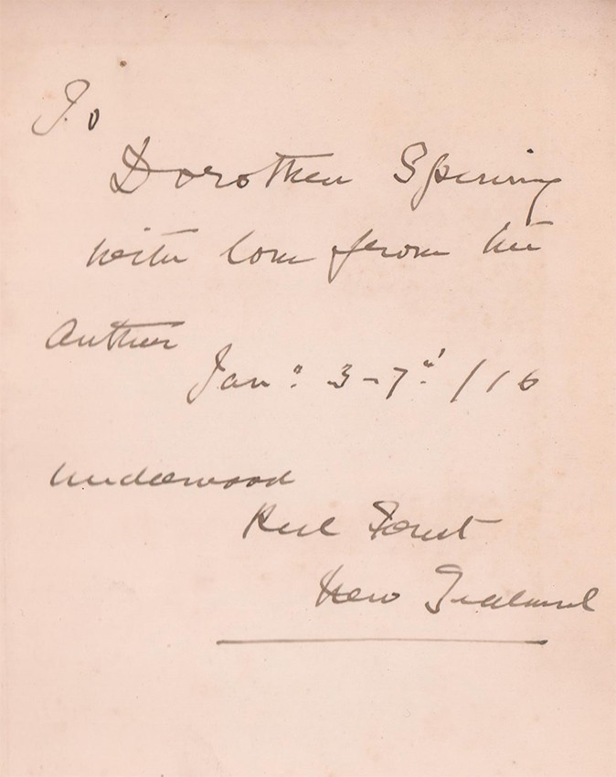 On front paste down end-paper: To Dorothea Spring with compliments from the author Jan 3 - 7/16