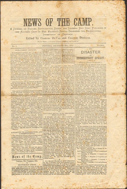 Original copy of the newspaper published in the beleaguered city of Pretoria, in which the main item of news is the disastrous ambush of the 94th Regiment under Colonel Anstruther at Bronkhorstspruit by Boer forces, during which many casualties occurred.The plant, type, printing presses etc., of the Transvaal Argus\' had been brought into camp when the evacuation of the town of Pretoria was decided upon, and the paper was printed on this. Deecker, once the manager of the Argus, \"arranged with Mr. C.K. White, the then proprietor of the \'Argus\', for the use of the plant, machinery, types, inks, printers, Kaffir steam-power, etc., that went to make up the constituent elements of the Transvaal thunderer.\" After the siege was lifted, some 200 copies were specially bound as souvenirs - but there are few single sheets extant.Some sporadic foxing and tears into margins, otherwise good condition